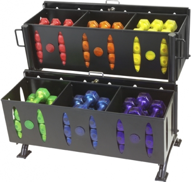 Конструкция двухъярусной стойки JB-R-2T от компании Hampton на каждом уровне имеет по три отделения, предназначенные для хранения различных по весу уретановых гантелей серии Jelly Bells Urethane для аэробики. Ее компактная и одновременно прочная конструкция позволяет оптимально использовать пространство вашего спортзала.
