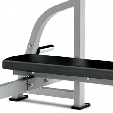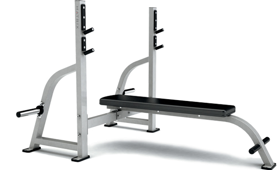 Эта скамья имеет горизонтальное положение, оснащено стойками и держателями для олимпийских дисков. Гриф размещается на специальном креплении. Стойки имеют наклон и делают тренажер устойчивым.