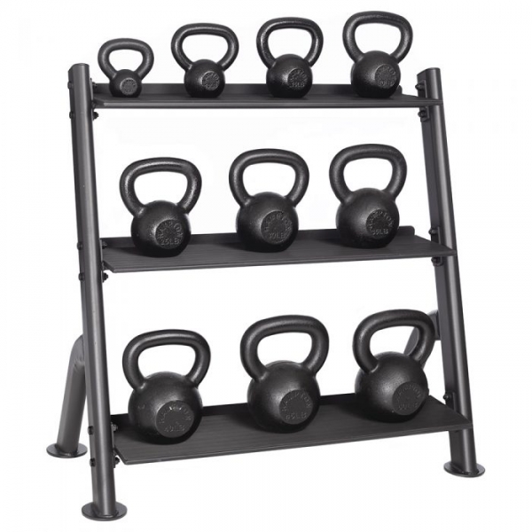 Трехъярусная подставка под гири KB-3T бренда Hampton вмещает один комплект гирь от 5 до 50 фунтов или 15 гирь весом от 5 до 100 фунтов. Стойка подходит как для домашнего использования, так и для оснащения зоны свободных весов в тренажерных залах любого уровня.