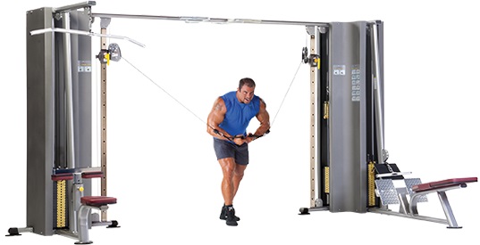 - Тренажер имеет по одной вертикальной и нижней тяге, одну регулируемую станцию (верхнюю/нижнюю) и одну станцию для подтягиваний.